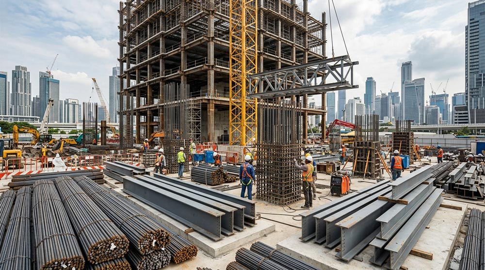 Essential construction materrials like cement, steel, aggregates, and roofing for reliable builds